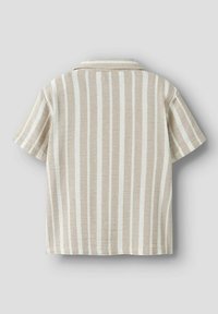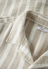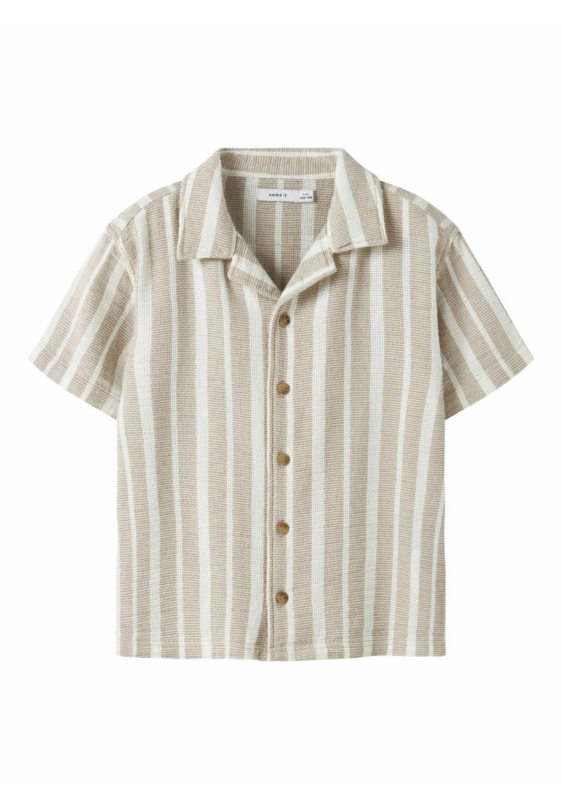 Béžová a bílá vertikálně pruhovaná košile s krátkým rukávem, límcem a pěti hnědými knoflíky vpředu.