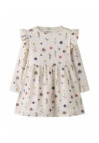 Krémové šaty s dlouhým rukávem s fialovým a růžovým květinovým potiskem, s volánkovými detaily na ramenou a řaseným pasem.