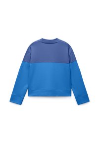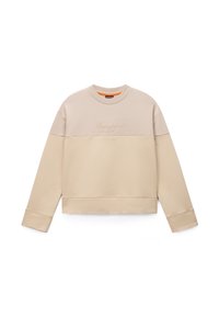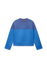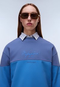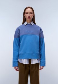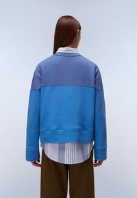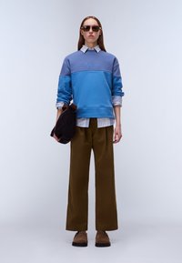 Mladá žena v modrém pruhovaném tričku na vrstvy a dvoubarevné modré mikině Napapijri s hnědými kalhotami, stojící před jednobarevným světlým pozadím.