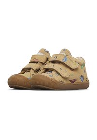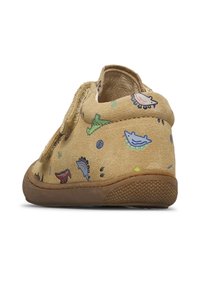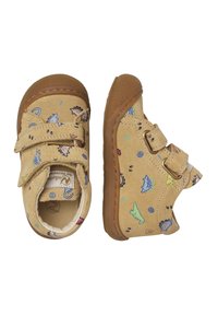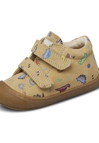 Dětská botka z semiše v barvě tan s gumovou podrážkou, dvěma suchými zipy a barevnými potisky dinosaurů a zvířat na svršku.