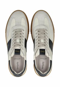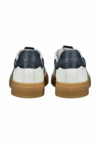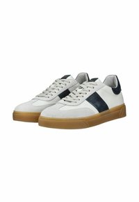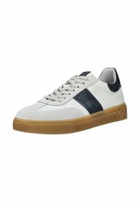 Bílá nízká teniska s námornicky modrými koženými detaily, šedými tkaničkami a podrážkou z gumové pryže, zobrazena z boku na bílém pozadí.
