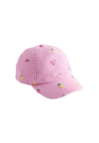 Světle modrá denimová čepice s barevnými vyšívanými detaily, včetně ovoce a květiny. Hladký povrch s obloukovým kšiltem.