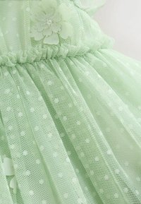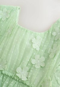 Světlé zelené šaty z průhledné látky s puntíkovaným vzorem, volánkovými rukávy, květinovými aplikacemi a stupňovaným lemem.