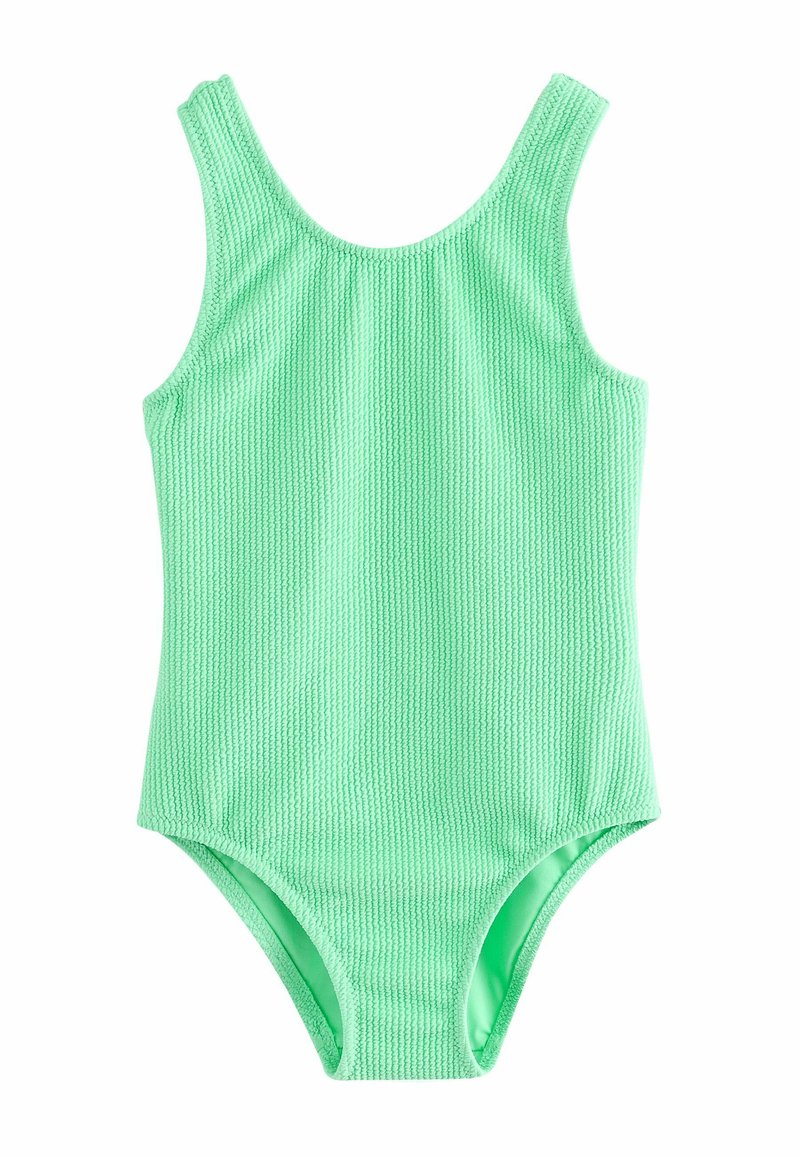 Zelený strukturovaný jednodílný plavky s výstřihem do véčka a širokými ramínky, s přiléhavým střihem a hladkým vnitřním podšívkou.
