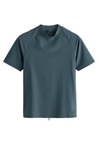 Modrá sportovní košile s krátkým rukávem vyrobená z hladké, lehké látky, s kulatým výstřihem a prošitými ozdobami na ramenou.