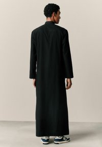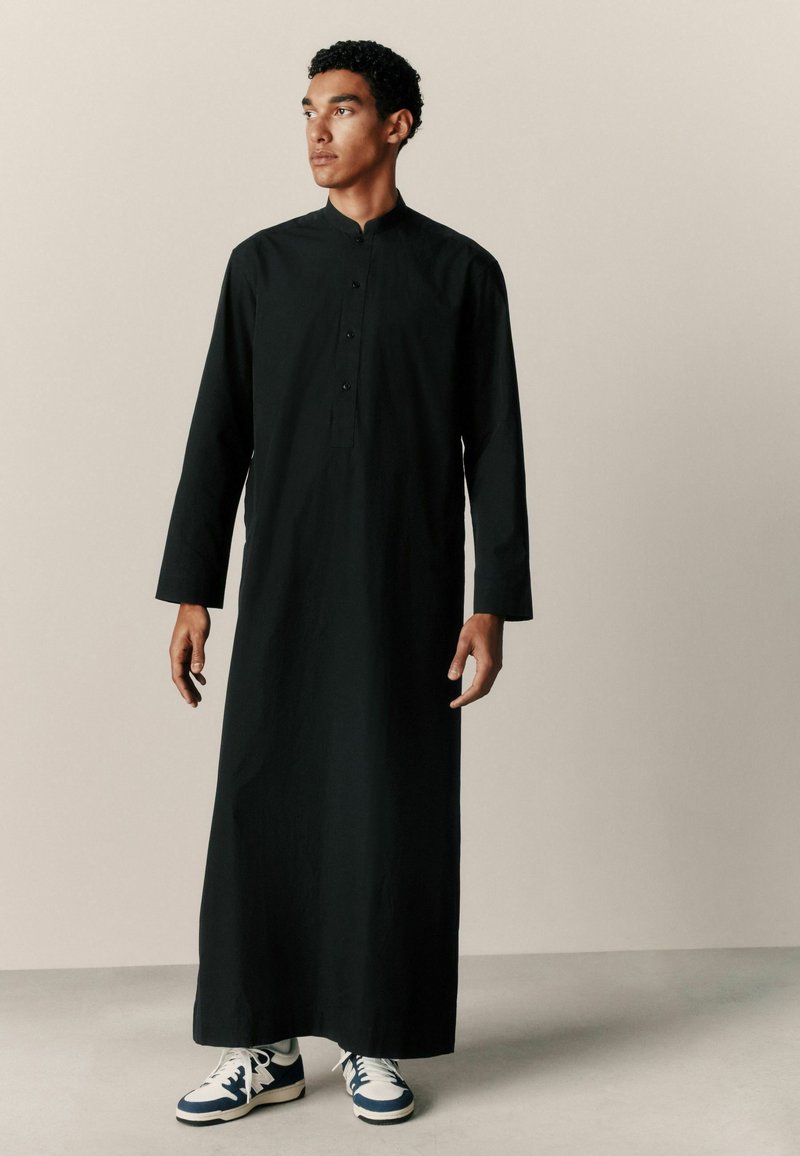 Černá dlouhá kurta s dlouhým rukávem vyrobená z bavlny, s vysokým límcem a jemným zlatým vyšíváním podél průramku, s volným střihem.