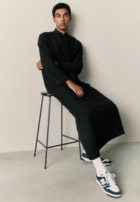 Černá dlouhá tunika s mandarínským límečkem, s knoflíkovým předním zapínáním, nošená přes bílé a námořnicky modré tenisky. Hladká textura látky.
