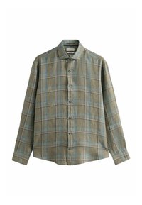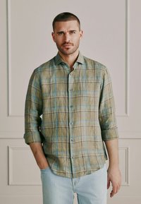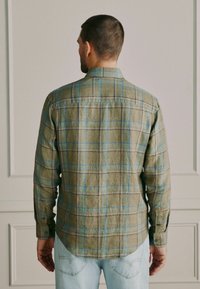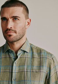 Muž upravující manžetu zelené kostkované košile s dlouhým rukávem s modrými a béžovými liniemi.