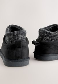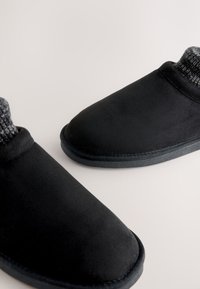 Černá pantofle s hladkým semišovým vzhledem a žebrovaným pružným lemem v šedé barvě. Má flexibilní podrážku a zadní poutko pro snadné nazouvání.