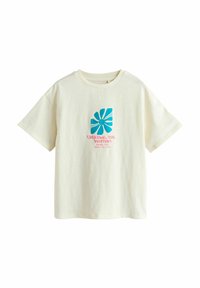 Tři krátké rukávy ležérních triček v korálové, smetanové a starorůžové barvě s modrobílými grafickými potisky a textem na hrudi.