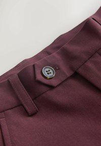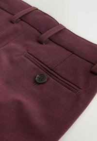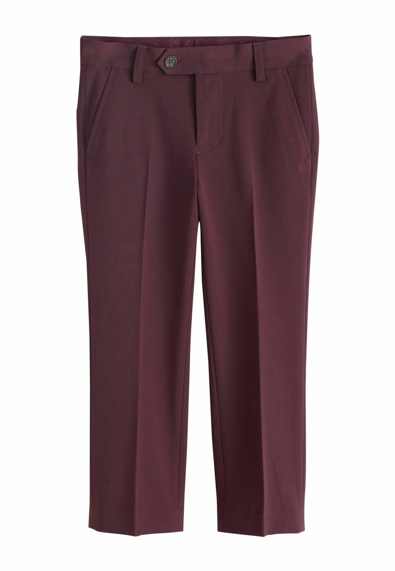Vínově červené kalhoty na míru s předním zapínáním na knoflíky, poutky na pásek a předními šikmými kapsami na bílém pozadí.