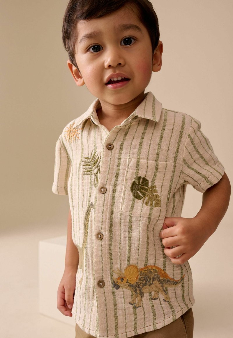 Mladý chlapec v béžové košili s krátkými rukávy, zelenými pruhy a výšivkou dinosaura a listů, stojící před neutrálním jednobarevným pozadím.