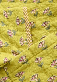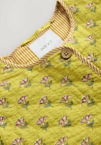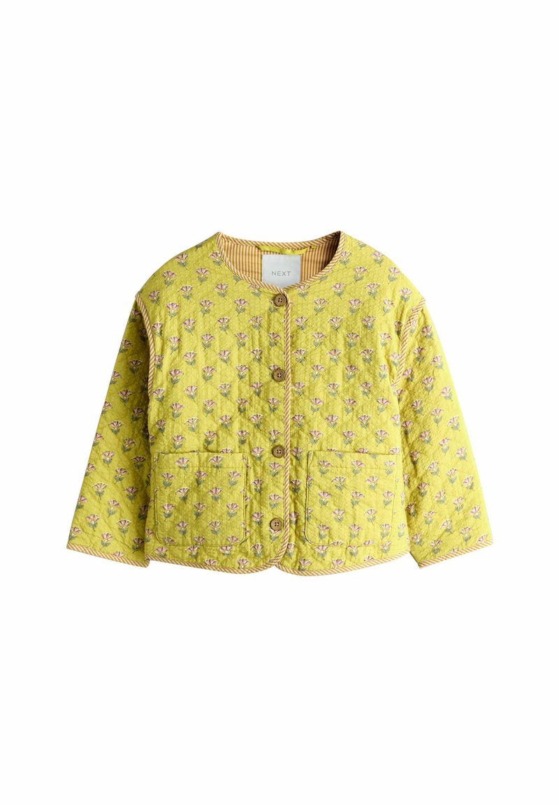 Žlutá prošívaná bunda s drobným květinovým vzorem, kulatým výstřihem, dřevěnými knoflíky, dvěma předními kapsami a proužkovaným ozdobným lemem.
