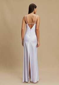 Večerní šaty z levandulového saténu s vodovým výstřihem, tenkými ramínky, přiléhavým střihem a mírným vlečkem. Kombinované se stříbrnými podpatky a náramkem.