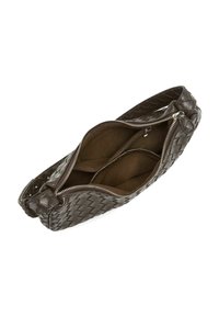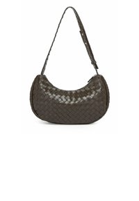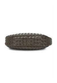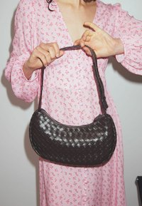Tkaná černá kožená kabelka s křivkovým siluetou, tenkým ramenním popruhem a hladkým povrchem, kterou drží osoba v růžových květinových šatech.