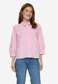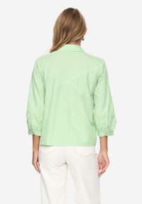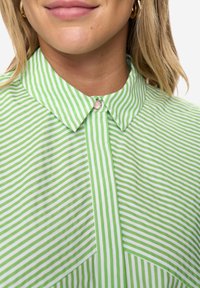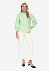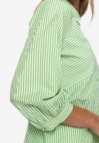 Žena s dlouhými blond vlasy, oblečená v zeleno-bíle pruhované blůze s tříčtvrtečními rukávy a bílých kalhotách, usmívající se s rukou v bok.