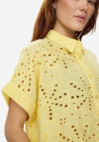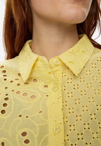 Mladá žena nosící volnou žlutou halenku s krátkými rukávy a knoflíky, zdobenou vyšívanými dírkami, a černé kalhoty, stojící před jednobarevným bílým pozadím.