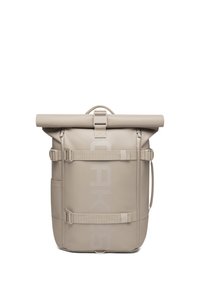 Černý batoh s rolovacím vrškem, nastavitelnými popruhy a sponami. Vyroben z odolného materiálu, který má velké logo. Hladký povrch, funkční design.