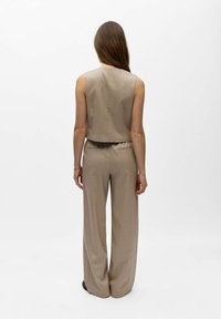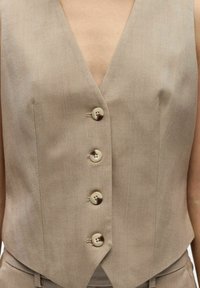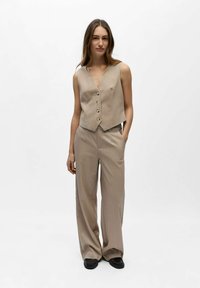 Žena s dlouhými hnědými vlasy, která má na sobě béžovou bezrukávovou vestu na knoflíky a ladící kalhoty s vysokým pasem, stojící s jednou rukou v kapse.