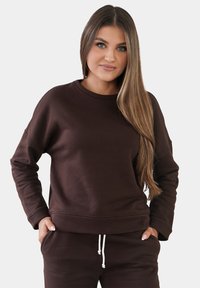 Fuchsiová mikina s kulatým výstřihem a dlouhými rukávy, volný střih a žebrované manžety. Tkanina vypadá měkká a hladká, ideální pro neformální nošení.