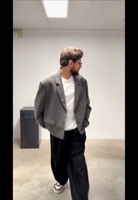 • Šedé strukturované sako přes bílé tričko, doplněné černými kalhotami s širokými nohavicemi. Má knoflíky, přední kapsy a ležérní střih.