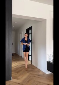 • Černý sportovní cropped top a šortky, doplněné modrou oversized mikinou. S průhlednou láhví vody v ruce, s bosýma nohama na dřevěné podlaze.