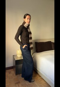 • Hnědý žebrovaný svetr s knoflíky, doplněný huňatým béžovým a hnědým pruhovaným šátkem. Hladká textura, vrstvený přes ležérní tmavě modré kalhoty.