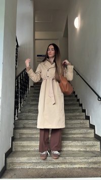 • Žena s dlouhými hnědými vlasy v béžovém trenčkotě, hnědých kalhotách a teniskách stojí na vnitřním kamenném schodišti a drží hnědou tašku přes rameno.