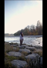 Žena v černém venkovním oblečení sedí na spadeném kmeni stromu poblíž travnatého břehu řeky s lesem a zamračenou oblohou v pozadí.