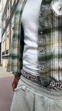 Džínová bunda s maskáčovým vzorem, světle šedé oversized kalhoty, černé tenisky s bílými akcenty, stojící proti texturované kamenné zdi.