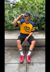 • Žluté a námořnické raglanové tričko s potiskem "92", černé ribkované šortky, červené tenisky a bílé ponožky s černými pruhy.