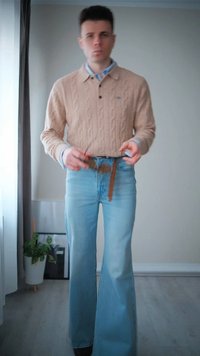 • Světle béžový svetr s pleteným vzorem a límcem, nošený přes světle modrou košili. Obsahuje malou emblemu a černý pásek se zlatým akcentem.