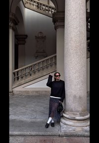 • Černý zkrácený svetr, pod ním bílá košile, průsvitná kostkovaná sukně v modrých odstínech, černé mokasíny, malá černá kabelka, stojící vedle kamenného sloupu.