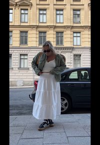 • Bílá strukturovaná sukně s volánovým lemem, kombinovaná s černými sportovními botami s bílými pruhy. Obsahuje detail olivově zelené bundy.