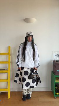 • Bílá bunda s černými pruhy, sukně s puntíky, vzorované kalhoty, černé tenisky a lesklá černá kabelka s logem Adidas. Vertikálně pruhovaná čepice.