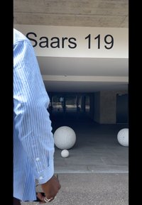 • Muž v modré pruhované košili a hnědých kalhotách, který drží sluneční brýle, jde směrem k vchodu budovy označené "Saars 119" s kamennými koulími venku.