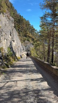 • Osoba kráčející po kamínkové zemi u velké skalní stěny, oblečena v tmavé prošívané bundě, hnědé pletené čepici, olivových kalhotách a teniskách.