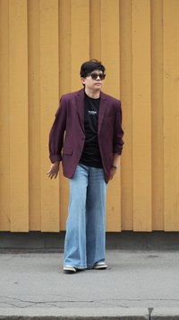 • Bordový blazer přes černé tričko, volné světle modré džíny a černé boty. Pozadí tvoří dřevěné stěny v žlutém tónu.