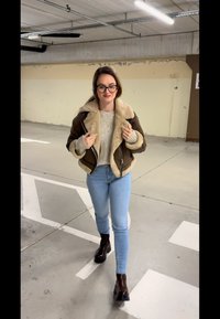 • Hnědá bunda z beránka přes světle šedý svetr, světle modré džíny a tmavě hnědé kotníkové boty na platformě v prostředí parkovací garáže.