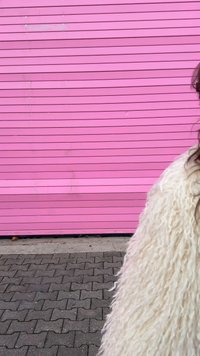 • Bílá chlupatá bunda, světle modré široké džíny a růžová kabelka. Černé sluneční brýle doplňují vzhled na pozadí s růžovými pruhy.