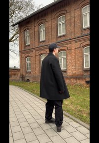 Černý kabát přes černý top, volné černé kalhoty a hnědé boty. Bordó kšiltovka a zelené keře v pozadí.