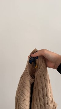 • Beige svetr s pleteným vzorem v kombinaci s hnědým kabátem, černými kalhotami a slunečními brýlemi, stojící poblíž kamenné sochy lva a schodiště.
