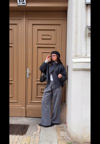 • Tmavě šedá nadměrná bunda s velkými knoflíky, kombinovaná s pruhovanými šedými kalhotami širokého střihu. Malá černá texturovaná kabelka a černý baret.
