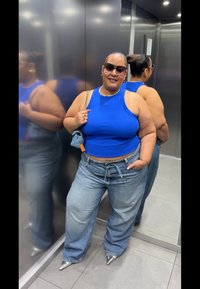 • Osoba má na sobě černé sluneční brýle a modrý top bez rukávů, drží bílou trubku v výtahu se metalickými stěnami. Viditelné jsou zlaté šperky.