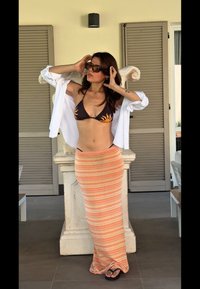 • Černé bikiny se slunečním motivem, vrstvené pod otevřenou bílou košilí. Oranžová pruhovaná sukně s leskem a rozparkem až k stehnům, držená v pase.
