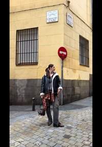 • Černá kožená bunda s ovčí vlnou, šedá mikina, kostkovaná košile svázaná kolem pasu a šedé džíny, na pozadí kamenné ulice.