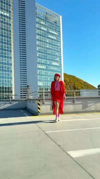 • Červený dlouhý kabát přes růžový top, červenou sukni, bílé boty, růžové ponožky se vzory a krémovou kabelku. Moderní městské pozadí.