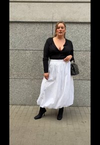 • Černý top bez ramínek, bílá splývavá maxi sukně, černé ploché sandály, červené náušnice, stojící proti kamenné zdi a zelenému pozadí.