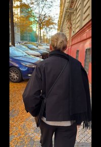 • Černá, volnější bunda s knoflíkovým zapínáním a velkým límcem, doplněná odpovídajícím šátkem. Nošená přes tmavé kalhoty, na podzimním listí.