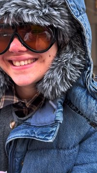 • Džínová bunda s kapucí vyloženou kožešinou, šedý svetr, kostkovaná košile, světle modré zvonové džíny a hnědé boty na šněrování. Hnědá kabelka přes rameno s přívěskem.